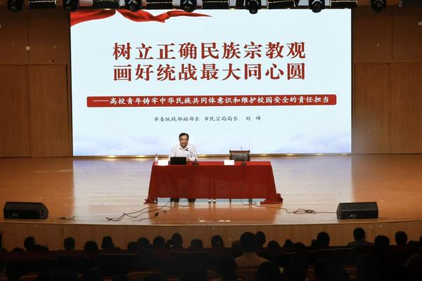 培训特邀连云港市委统战部副部长、市民宗局局长刘峰作《树立正确民族宗教观 画好统战最大同心圆——高校青年铸牢中华民族共同体意识和维护校园安全的责任担当》专题讲座。围绕树立正确中华民族历史观,铸牢中华民族共同体意识,树立马克思主义宗教观,抵御和防范宗教向校园渗透等方面,深入解读铸牢中华民族共同体意识的时代内涵,教育引导师生争做民族团结的践行者、强国建设的奋斗者、理想信念的坚守者、中华文化的传播者。