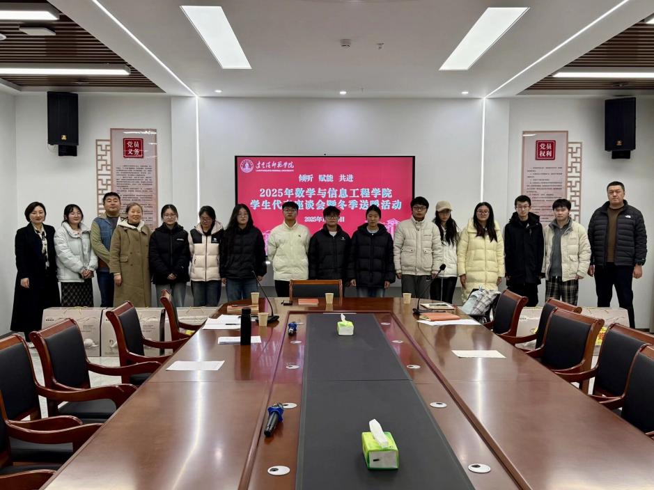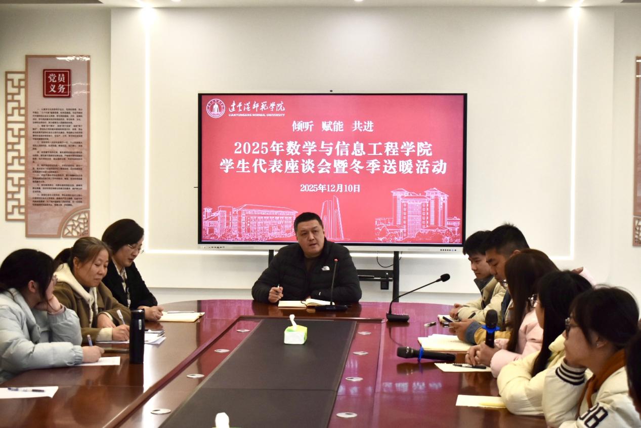 12月10日下午,“倾听・赋能・共进——2025年数学与信息工程学院学生代表座谈会暨冬季送温暖活动”在“一站式”领航工作室温情举行。学院党总支书记王晓光、院长朱海燕、党总支副书记马黎艳,以及辅导员、班主任代表、各年级学生代表共同参与了本次活动。