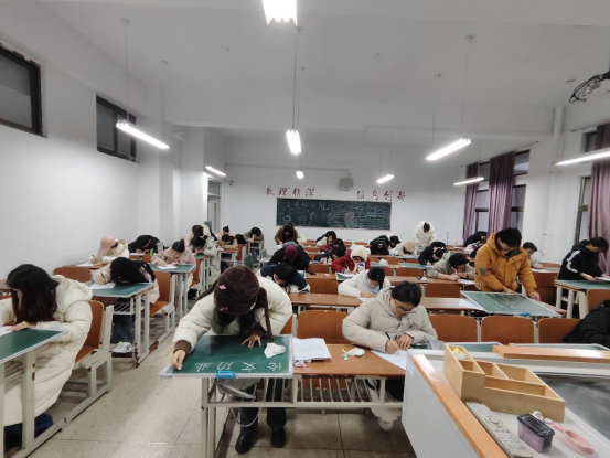 考核现场秩序井然、气氛热烈,同学们以饱满的精神状态全神贯注投入考核。硬笔字考核环节,同学们坐姿端正、握笔规范,在规定时间内凝神书写,笔下字迹或清秀工整、或刚劲有力,卷面整洁有序。粉笔字考核中,部分学生字迹规范匀称、排版逻辑清晰、整体美观大方,展现出过硬的板书功底;部分学生则存在笔画乏力、结构失衡、布局杂乱等问题,有待进一步提升。评分老师全程细致巡查,针对每位学生的板书表现,从书写技巧、排版布局、整体观感等多维度进行打分,助力学生明确提升方向。